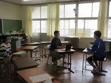 3年英語では、パフォーマンステストを考えて、ALTの先生と英語の先生で、個別にスピーキングの練習です。一人ずつやっていただいています。緊張しますね。