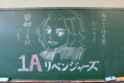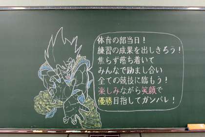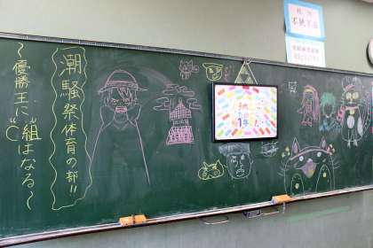 各クラスの黒板には、潮騒祭体育の部に向けたメッセージが書かれていました。どのクラスも絵が上手ですね!