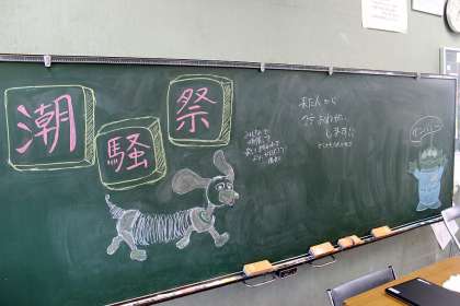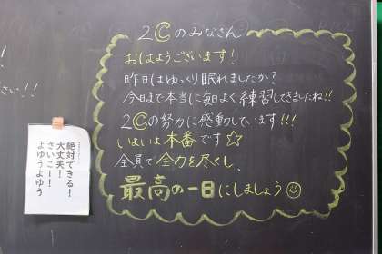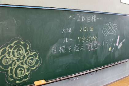 2年生の黒板です。各種目における具体的な目標や、先生からのメッセージが書かれていました。
