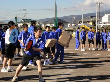 グランドでは、「ミラクルドッチボール」が行われました。王様を兵隊達が守るという内容です。コートが円形で4つの陣地に区切られているため、いたる方向からフリスビーやゴムボールなどが飛んでくるため、みな事前に思い思いの形で作った盾(シールド)で王様を守ろうと必死でした。