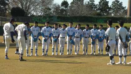 昨日(12月10日)愛鷹球場において、第10回沼駿地区中学生野球教室が開催され、本校野球部生徒、野球関係生徒が参加し、この秋6大学優勝、明治神宮大会大学日本一にまった明治大学の選手に直接指導を受けました。本校の指導に主に入ってくれた選手は、写真のように桐蔭学園出身の2年生中嶋啓喜外野手(背番号9)とPL学園出身の2年生武井友孝捕手(背番号12)でした。日頃とは違う練習に選手たちは集中して取り組んでいました。