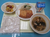 【本日の献立】きつねうどん、牛乳、もやしの酢醤油和え、キャラメルポテトきつねうど...