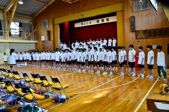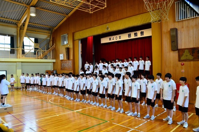 休憩をとった後、生徒は自主的に全校合唱隊形を作り始めます。3年生が素早く並び始めます。これも立派な伝統になっています。
