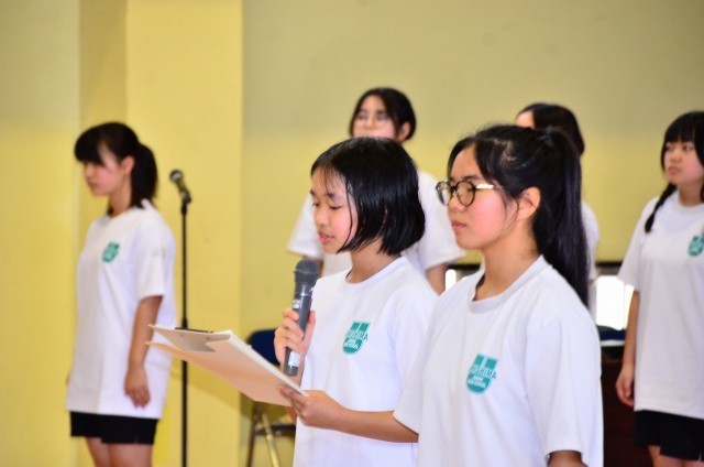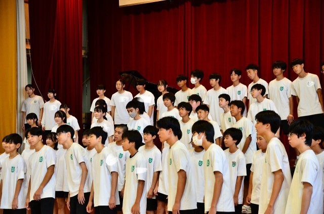 引き続き、プログラム5番 全校合唱「浮島のうた」です。この後の合唱コンクールの発声練習を兼ね、先輩たちが創り上げたこの歌を全身全霊で歌い上げます。