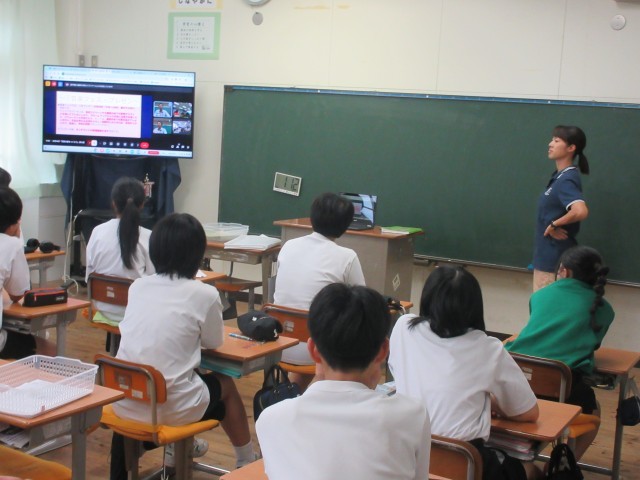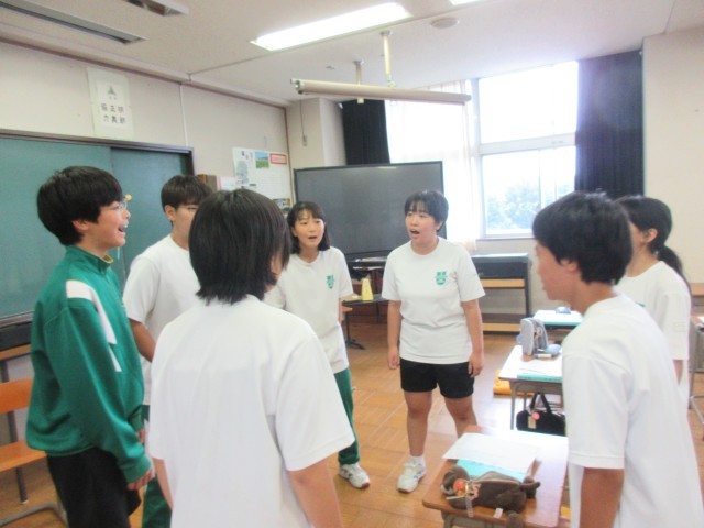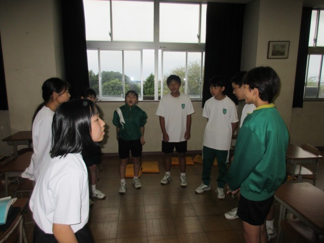中間テスト(歌唱実技テスト)の直前練習の場面です。グループで最後の調整をしています。合唱コンクールからさらに磨きがかかっています。ここで培ったパフォーマンス力をこの次の言語読解の時間(小規模校連携授業で各学校で創り上げた歌をプレゼン・披露する会)に活かしていきます。