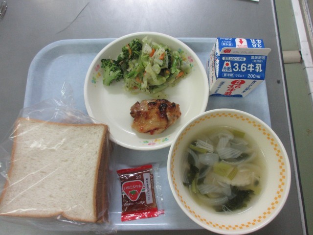 本日の給食は、鶏肉のチリソース焼き、野菜のガーリックバジルソテー、ラビオリスープ、いちごジャム、食パン、牛乳です。美味しくいただきました。
