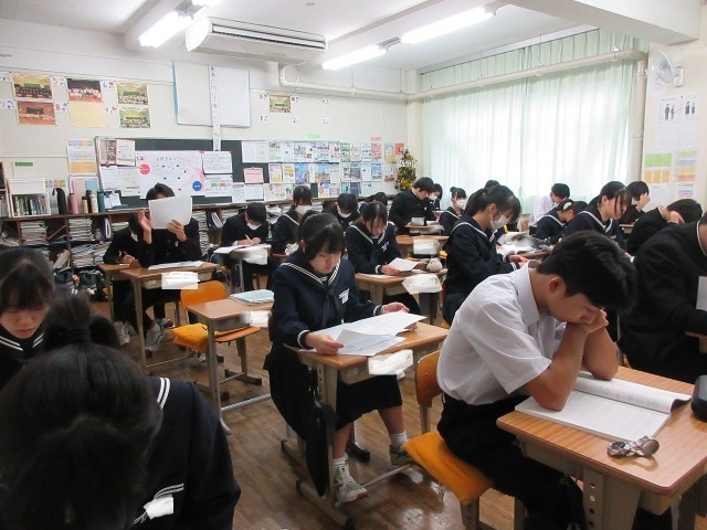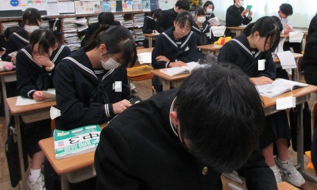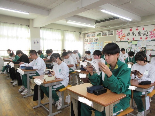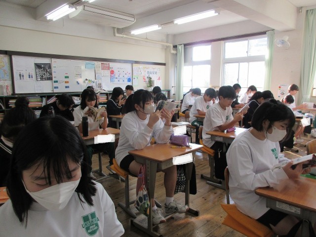 3年生は、この後の第2回学力調査に向けて、直前学習をしていました。最後の見直し、準備万端です!!頑張れ受験生!!!1・2年生は静かに読書タイム・・・2年生の皆さん、来年は受験生となりテストですね。今のうちにたくさん本に触れてほしいです。心と脳に栄養を!!!