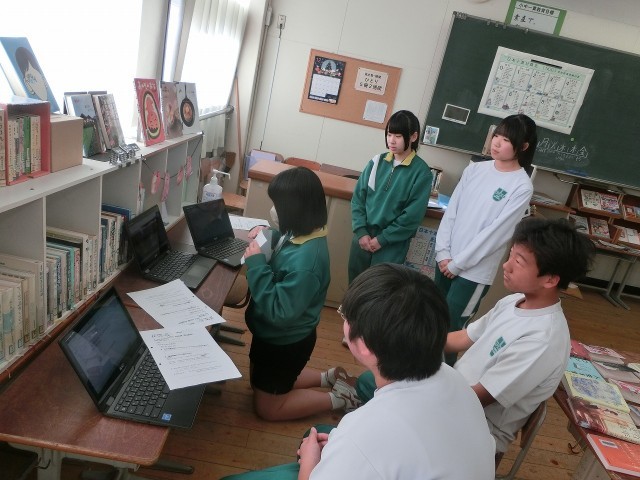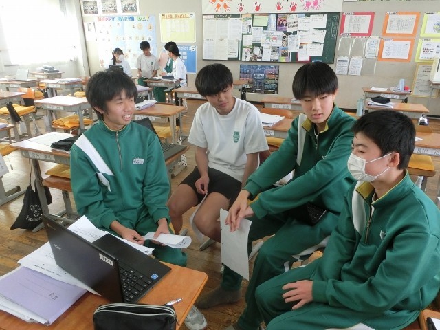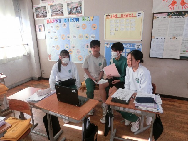 今年度は、小規模連携の取り組みの一環として戸田中学校とオンラインで結び、合同で英語の授業を実施しています。2年生の英語の学習内容に基づき、生徒たちが英語での対話に慣れ親しむことを目的として実施しています。今回も両校の生徒でグループに分かれ、互いに自己紹介をしたり、共通のテーマについて意見を交わしたりと、積極的に交流を深めることができました。