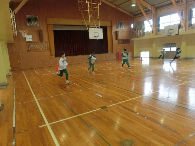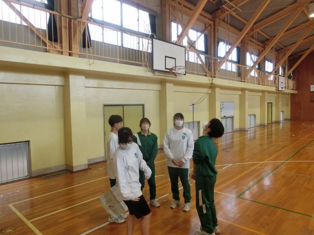 体育館で、新聞紙が床におちないように走るレース!?協力して、みんなで盛り上がっていましたね!