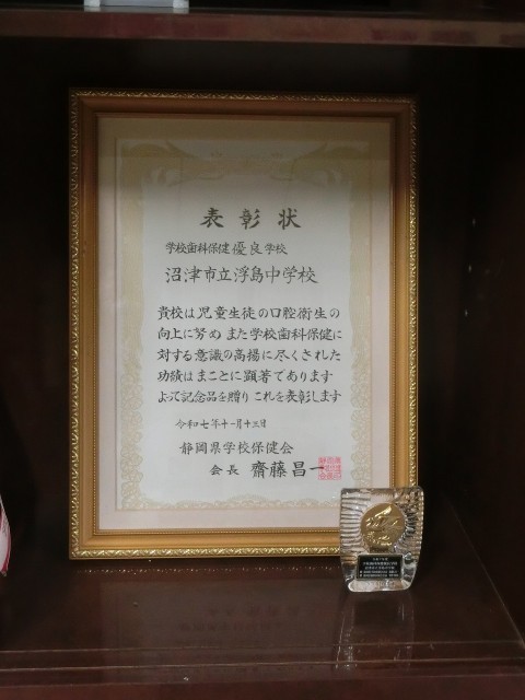 終業式終了後、書写、美術、スポーツなど、多数の表彰が行われました。また、歯科の衛生状況の優良校として県医師会から「学校歯科保健優良学校」として表彰を受け、代表で給食保健委員会に賞状と盾を手渡し、紹介させていただきました。さらに、10月に実施された「沼津市子どもの遊び王国」にて、浮島クラブが「メダカの紹介」を行いました。その関係で、市P連会長様から感謝状が浮島クラブメダカ班に手渡されました。