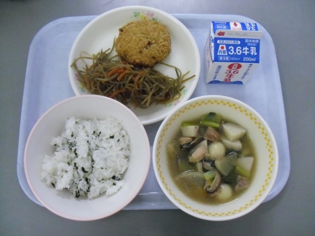 年明け第1回目の給食は、お雑煮、メンチカツ、きんぴらごぼう、わかめご飯、牛乳です。テストの後はお腹ペコペコ・・・しっかり食べて、あと1教科のテストに備えましょう。あと少し・・・頑張れ浮中生!!!