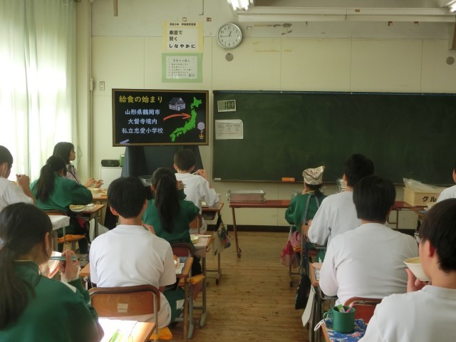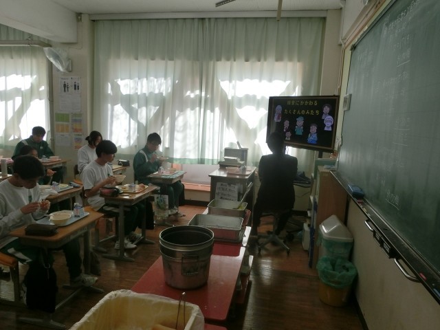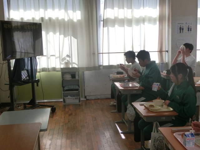1月24日から30日の「全国学校給食週間」に合わせ、本校では給食の時間に全校で関連動画を視聴しました。動画では給食の歴史などを学び、毎日食べている食事が、多くの人々のつながりによって支えられていることを再確認する機会となりました。