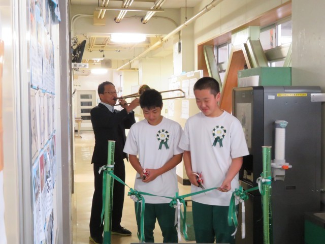 校長先生のトロンボーンでのファンファーレ演奏でセレモニーの幕が開け、生徒会長と副会長の2人でテープカットを行いました。いつでも温かいお茶と冷たいお茶が飲めるようになりました。ありがとうございます。大切に使わさせていただきます。