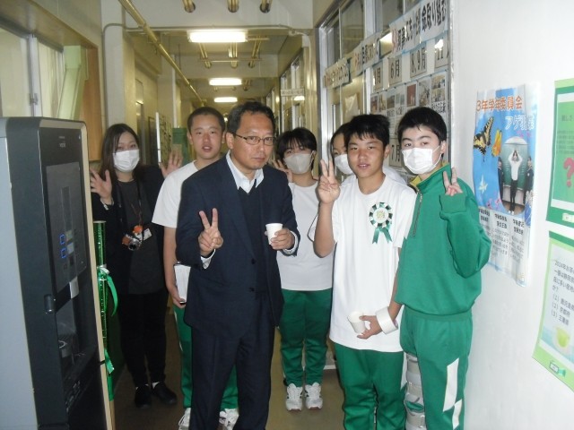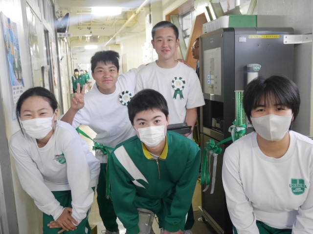 体育館のグランドピアノに引き続き、給茶機をはごろも教育研究奨励会様よりいただきました。本日は、生徒会本部主催の「テープカットセレモニー」を行いました。