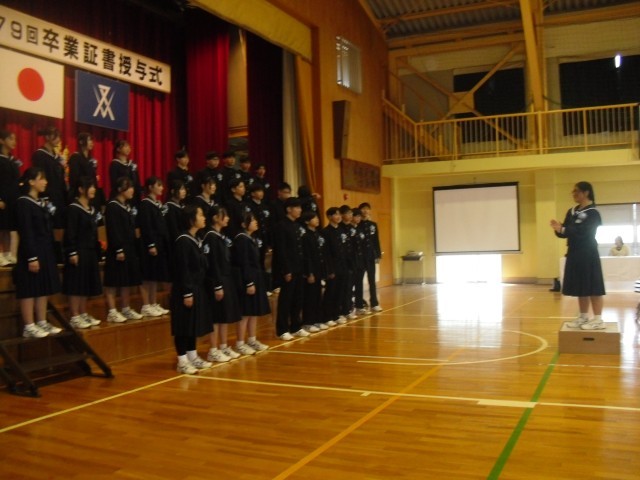 卒業式終了後、卒業記念合唱が演奏されました。今年度は、なんと3曲歌いたいという3年生のリクエスト。「大地讃頌」「3月9日」「Sоranji」。歌い終わった後、湧き起こった拍手・・・浮島中の伝統の歌声、たくさんの感動を残してくれた3年生の皆さん。ご卒業おめでとうございます。