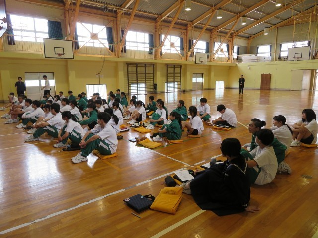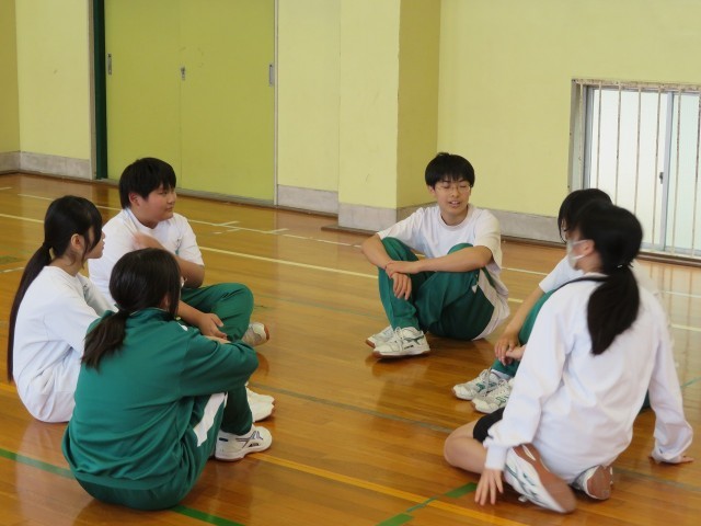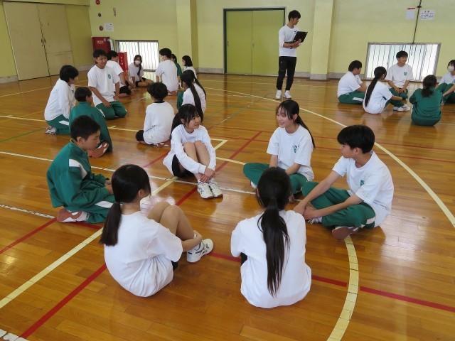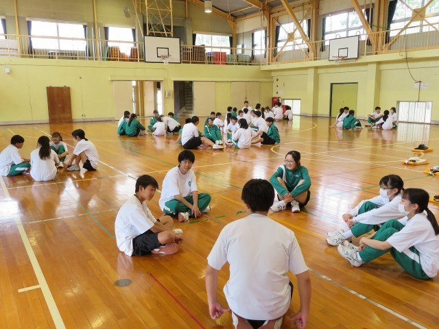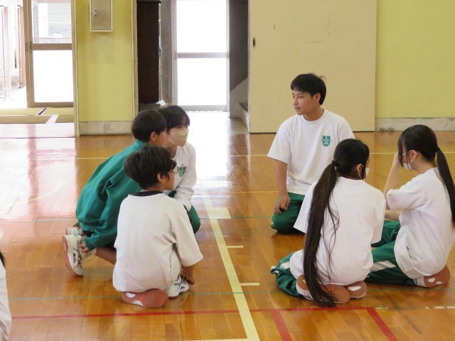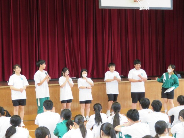 リーダーから、今年度のスローガン「仲間と輝け ウルトラソウル!」が発表されました。2年生が大きな声でスローガンを読み上げるなど、上級生がさまざまな場面でハツラツと全体を引っ張る姿がとても印象的でした。その後、自然教室で活動するグループごとに交流活動が行われました。