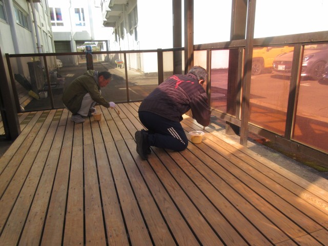 体育館と校舎を繋ぐ渡り廊下が、雨風を受けて、ペンキも剥がれていたので、卒業記念奉仕作業として3年生が塗ってくれることになりました。その前段階として、残っていたペンキをグラインダーで剥がして、板と板の間を用務員さんと職員が事前に塗りました。完成した渡り廊下を楽しみにしています。
