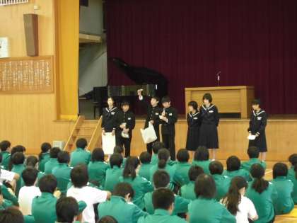 20日(水)の朝、生徒集会を行いました。生徒会より活動目標、チョボラ・チョベル・あいさつ運動・体育館解放について説明がありました。