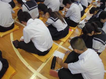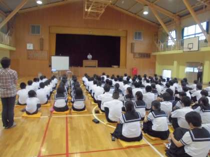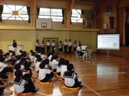 28日(火)、朝礼を行いました。校長先生よりこれから始まる中体連についてお話がありました。その後、保健委員会より熱中症について、映像資料やクイズ、簡単なセルフチェックを交えながら全校生徒に熱中症予防を呼びかけました。