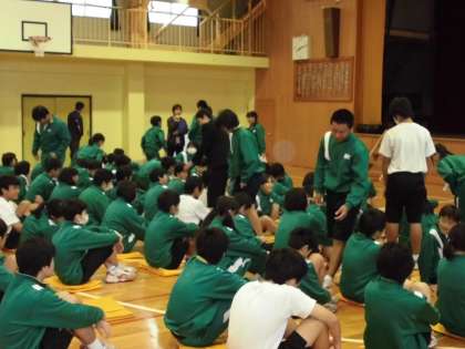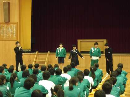16日の朝、生徒集会を行いました。生活委員会より、これからの服装についての注意喚起と服装チェックを行いました。
