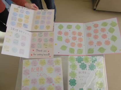 2月21日。給食委員会は、本校の配膳員さんと愛鷹小の栄養士さん、調理員さんたちへ感謝の色紙を贈呈しました。