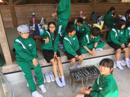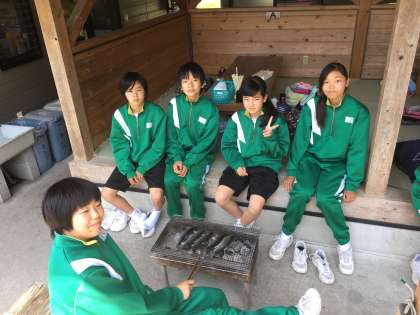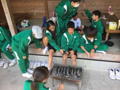 先程釣った鱒を焼いています。