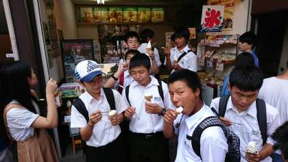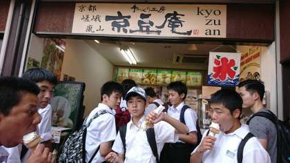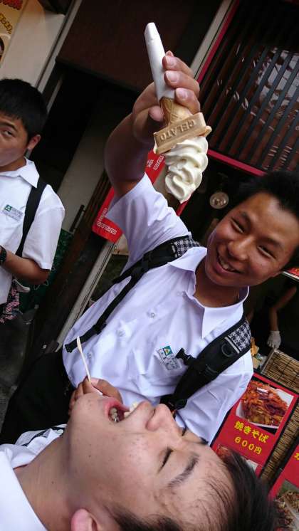 嵐山散策。落ちないアイスクリームを食べています。さかさまにしても落ちません。