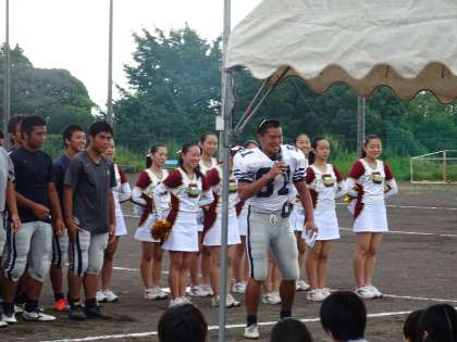 8月29日、始業式を執り行った後に、知徳高等学校アメリカンフットボール部とチアリーダー部の生徒さんをお招きし、部活動の様子を披露していただきました。