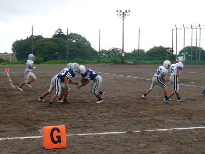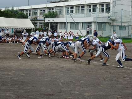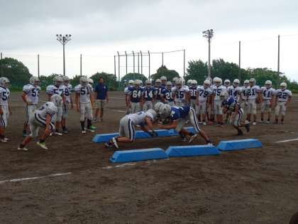 アメリカンフットボール部の練習は迫力満点でした。生徒はその様子に圧倒されているようでした。