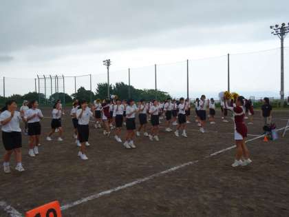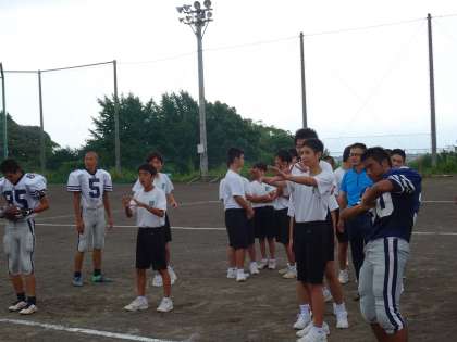 練習や演技を見た後に、実際に体験しました。パスやキャッチ、振り付けに苦戦している様子でした。