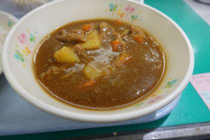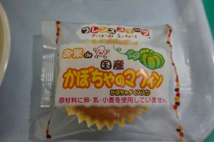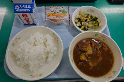 カレーライス、牛乳、キャベツとコーンの炒め物、かぼちゃマフィン
