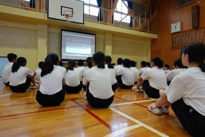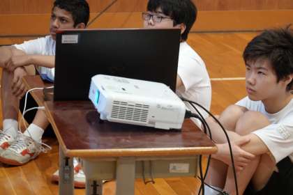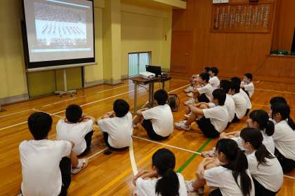 昨年度の古紙回収の収益金で購入したプロジェクターを使って、集団行動の動画を見ました。