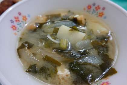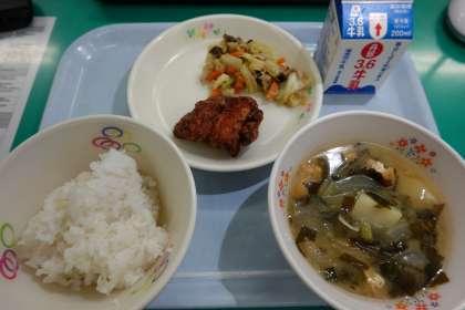 ご飯、牛乳、鳥の唐揚げ薬味ソースかけ、ツナと野菜の炒め物、油揚げとジャガイモの味噌汁