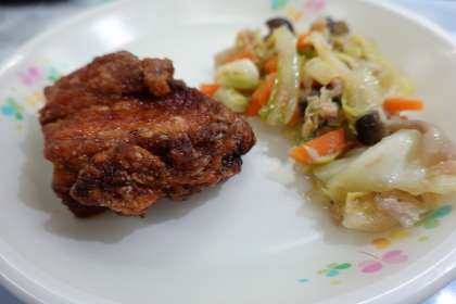 令和最初の給食は、鳥の唐揚げです。甘酢味のたれがかかって、食欲をそそります。