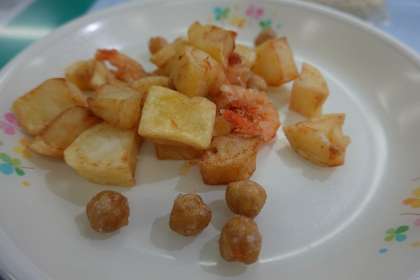タンメン、牛乳、小エビとポテトの唐揚げ、フルーツ杏仁豆腐