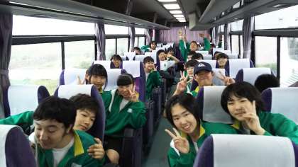 あいにくの雨のため、バスの中で、点呼、健康観察を行いました。