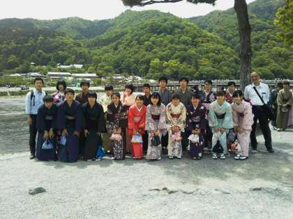 嵐山につきました。渡月橋を背景に3Aの学級写真です。
