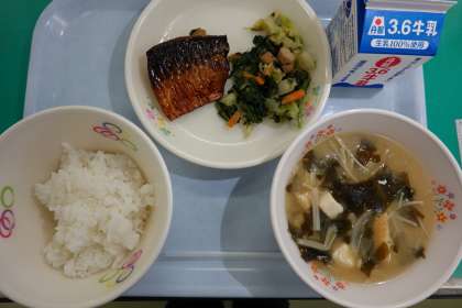 ご飯、牛乳、鯖のみりん干し、ウインナーと野菜のカレー炒め、豆腐とタマネギの味噌汁