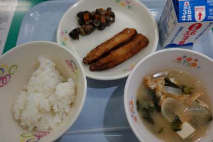 ご飯、牛乳、イワシの蒲焼き、五目煮豆、ジャガイモとタマネギの味噌汁