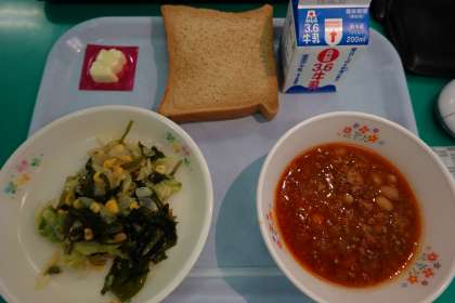 黒糖パン、牛乳、チリコンカン、海藻サラダ、チーズ
