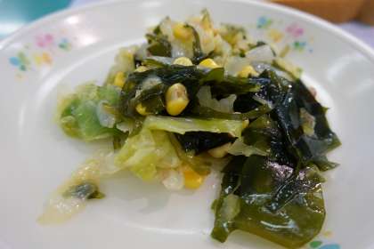 今日の給食はミネラルたっぷりの海藻サラダです。なお、生徒はパン2枚です!