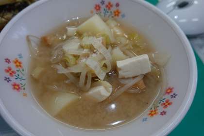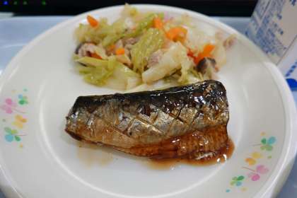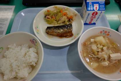 ご飯、牛乳、イワシの煮付け、豚肉と野菜の炒め物、豆腐ともやしの味噌汁