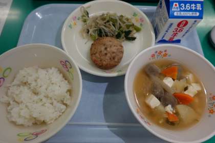 今週は「ふるさと給食週間」です! 今日の給食では、静岡県産の米、函南町産の牛乳、静岡県内産の筍が入ったハンバーグ、沼津産のタマネギ、小松菜、葉ネギ、御殿場産のもやし、焼津で作られている削り節、御殿場で作られている醤油を使っていました。