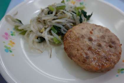 ご飯、牛乳、てりやきハンバーグ、もやし炒め、駿河汁