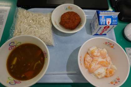 ソフト麺カレーソース、牛乳、枝豆コロッケ、ヨーグルト和え