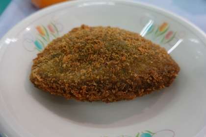 駿河湾しらす干しご飯、牛乳、黒はんぺんお茶フライ、さわに腕、冷凍ミカン