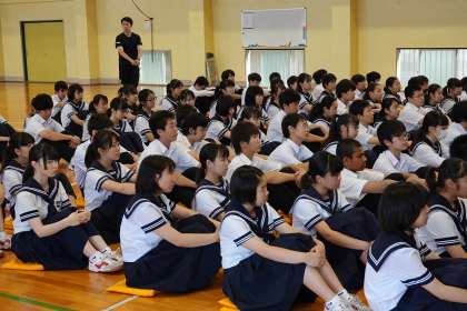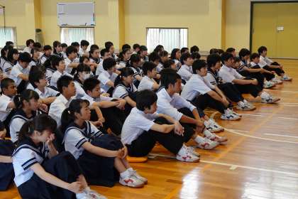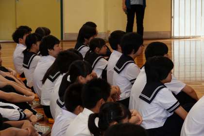 校長先生のお話を真剣に聞いています。