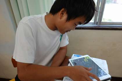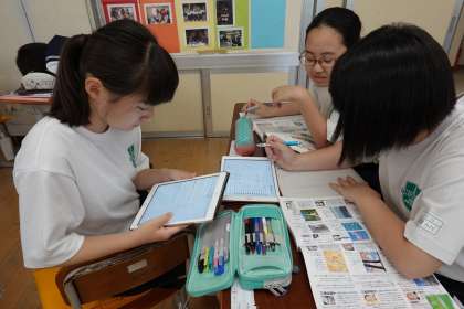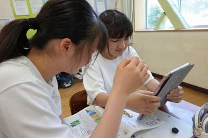 タブレットPCを用いて、表現に用いる言葉を調べて、俳句作りを行っています。