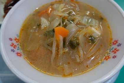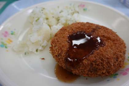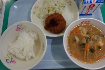 ご飯、牛乳、キャベツメンチカツ、青のり粉ふきいも、肉団子と野菜のスープ