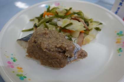 ご飯、牛乳、さわらのごま味噌かけ、ハムと茎わかめの炒め物、けんちん汁